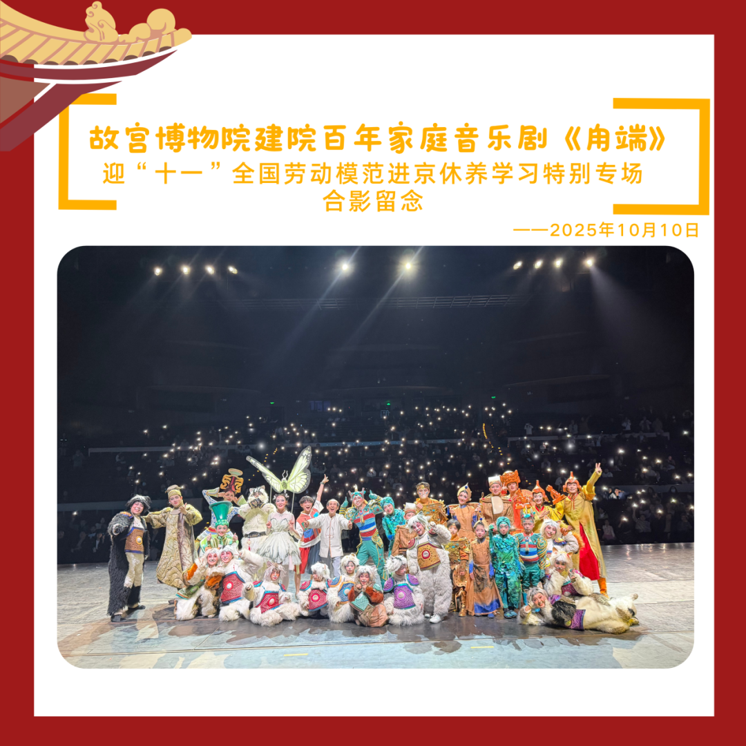 2025年10月10日,为庆祝故宫博物院建院百年,由故宫博物院出品、中国文学艺术基金会公益支持的家庭音乐剧《甪端》在京举办全国劳动模范特别专场演出。近千名全国劳动模范与北京百位“小甪迷”共同回顾故宫百年守护之路,感受几代故宫人特别是文物南迁历程中展现的坚守与担当。