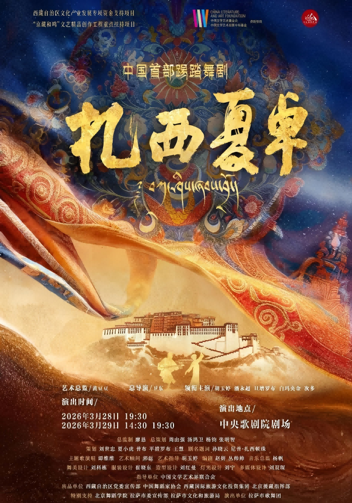 2026年3月28日,由中国文学艺术基金会 中国文学艺术发展专项基金资助,西藏自治区党委宣传部、中国舞蹈家协会联合出品的中国首部踢踏舞剧《扎西夏卓》在中央歌剧院首演。这部作品是“京藏和鸣”文艺精品创作工程重点扶持项目之一,历时三年有余创作打磨,是北京与西藏两地艺术力量协同创作的成果。